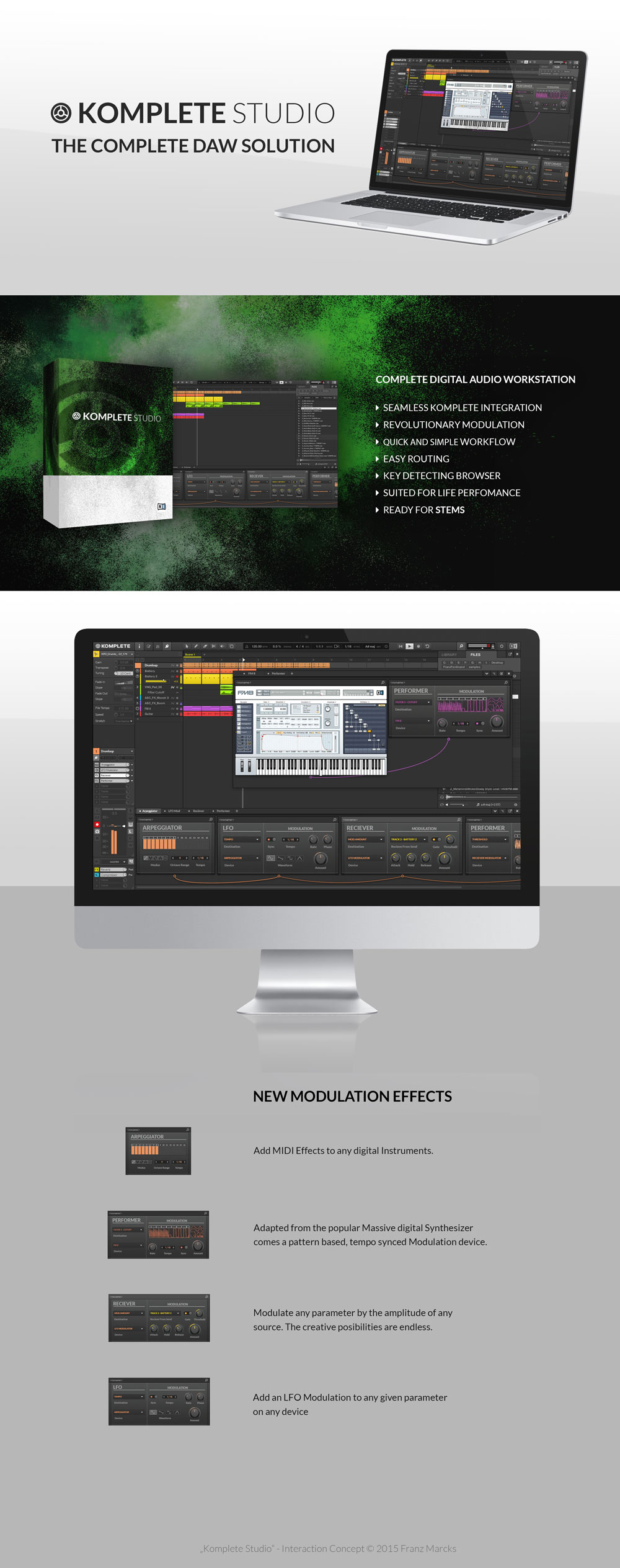 I´m fascinated with audio technology. The Berlin based company Native Instruments produces digital instruments called Komplete, DJing software Traktor and the groove production studio Maschine. From my perspective, the only software I was missing from their product portfolio was a full digital audio workstation. I decided to lay down an indepth concept of GUI- and UX-Design for an imaginary DAW called "Komplete Studio".