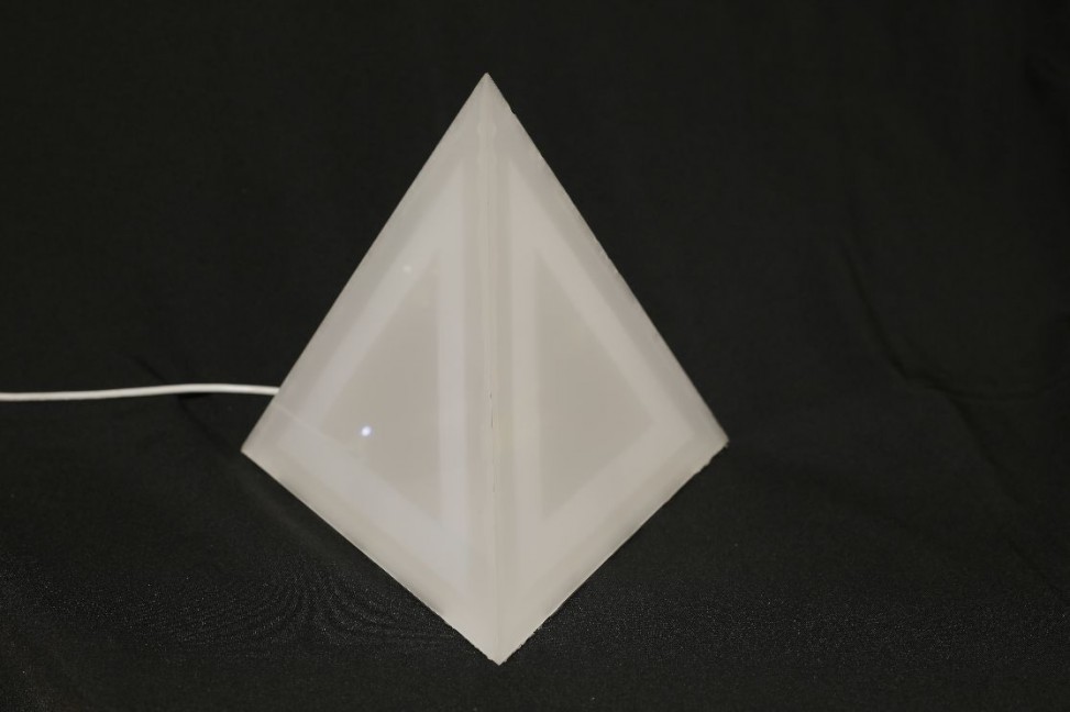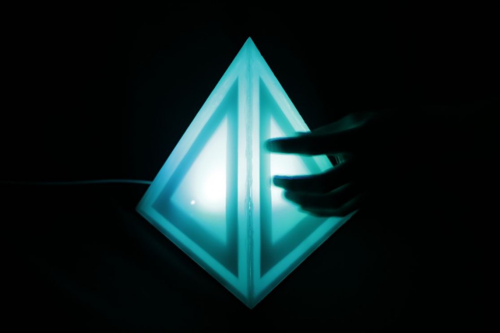 When performing on a stage, most of a DJs activity behind the desk remains invisible for the crowd. Pyramidi aims to change that. It is a MIDI Controller in shape of a tetrahedron. Each face of the object is a capacitive sensor, transmitting MIDI control changed or note triggers. Thus, the controller can be used as a drumkit, an effects unit, and instrument and much more. The transmitted values are visualized by illuminating the object from within. Every side triggers one base color of the RGB spektrum and when multiple sensors are triggered, the colors mix seamlessly, making the performance visible for everyone on the dancefloor.